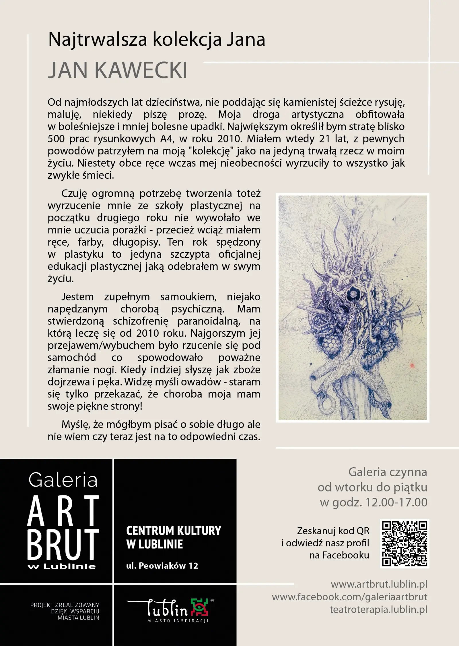 Jestem zupełnym samoukiem, niejako napędzanym chorobą psychiczną. Mam stwierdzoną schizofrenię paranoidalną, na którą leczę się od 2010 roku. Najgorszym jej przejawem/wybuchem było rzucenie się pod samochód co spowodowało poważne złamanie nogi. Kiedy indziej słyszę jak zboże dojrzewa i pęka. Widzę myśli owadów - staram się tylko przekazać, że choroba moja mam swoje piękne strony! Myślę, że mógłbym pisać o sobie długo ale nie wiem czy teraz jest na to odpowiedni czas.