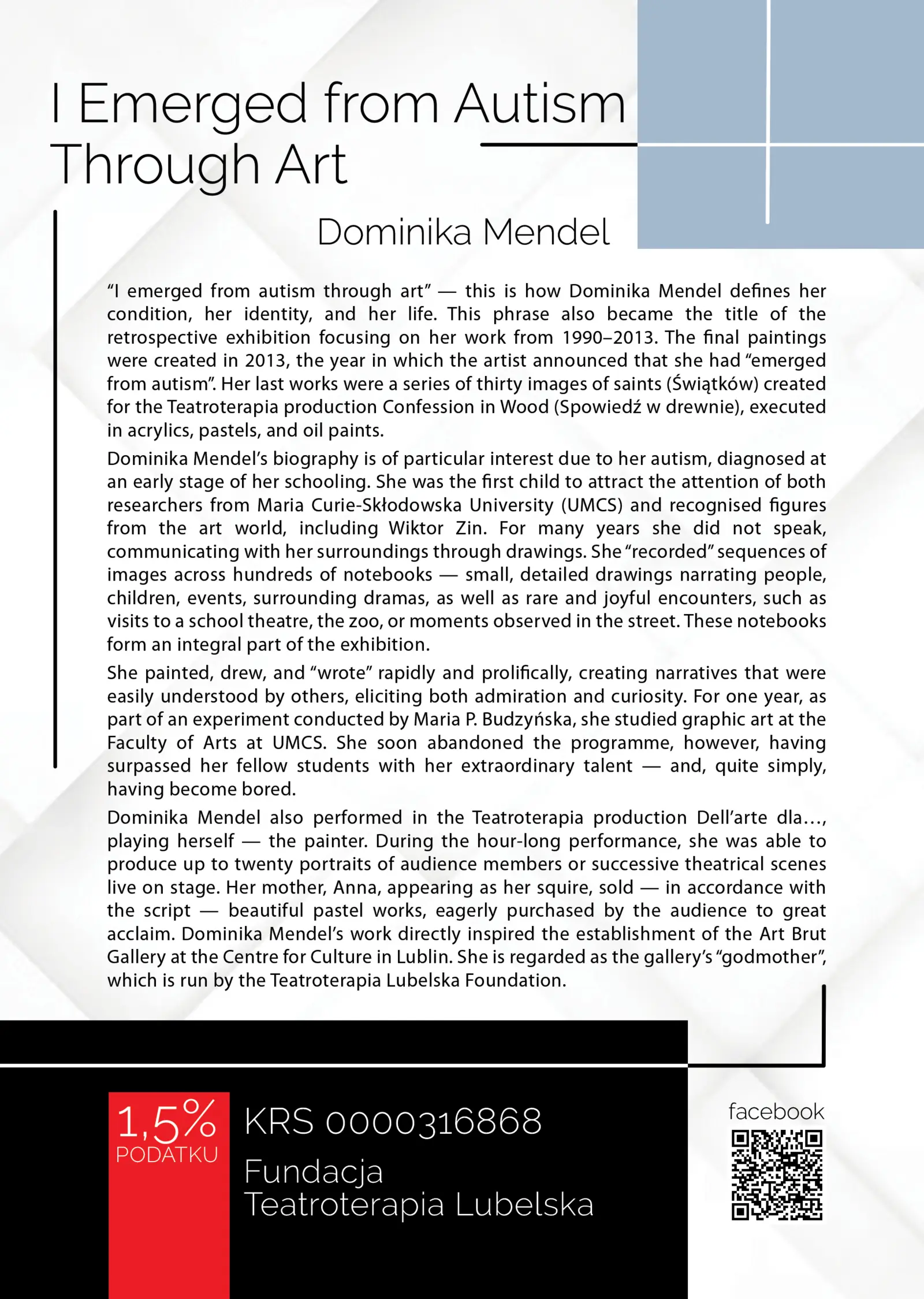 “I emerged from autism through art” — this is how Dominika Mendel defines her condition, her identity, and her life. This phrase also became the title of the retrospective exhibition focusing on her work from 1990–2013. The final paintings were created in 2013, the year in which the artist announced that she had “emerged from autism”. Her last works were a series of thirty images of saints (Świątków) created for the Teatroterapia production Confession in Wood (Spowiedź w drewnie), executed in acrylics, pastels, and oil paints.