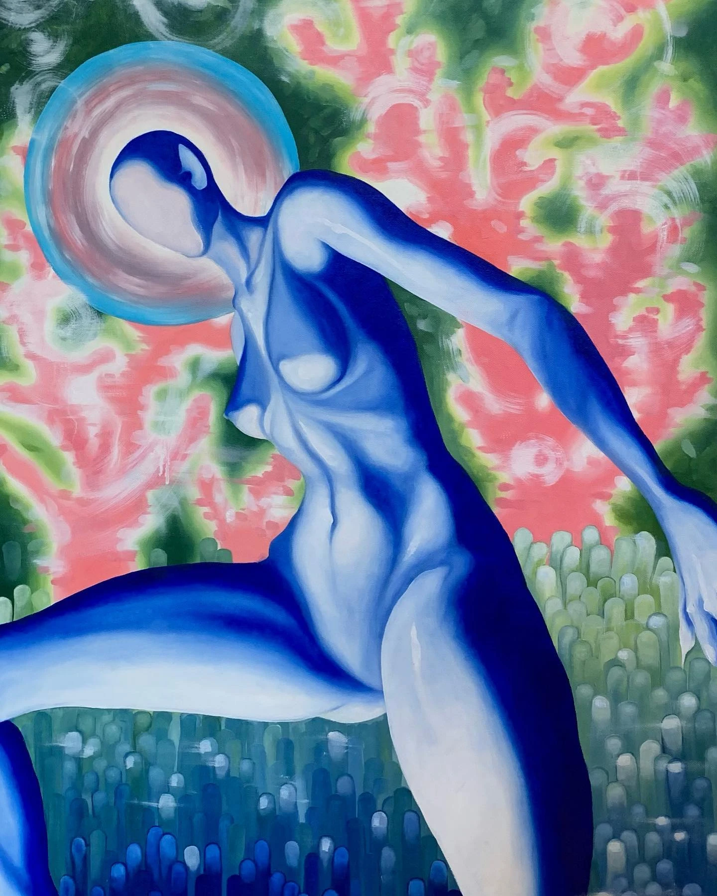 Yet, in many of the works, certain recurring elements can be discerned. One of the most striking motifs is the female figure and its corporeality—often reduced to minimalist, simplified forms. The women’s rounded bodies are stripped of anatomical detail, yet adorned with features drawn from the world of fantasy. The essence of femininity in Litvinova’s art manifests through smooth, almost metallic shapes; outlined, accentuated hips; and the anonymity of facial features.