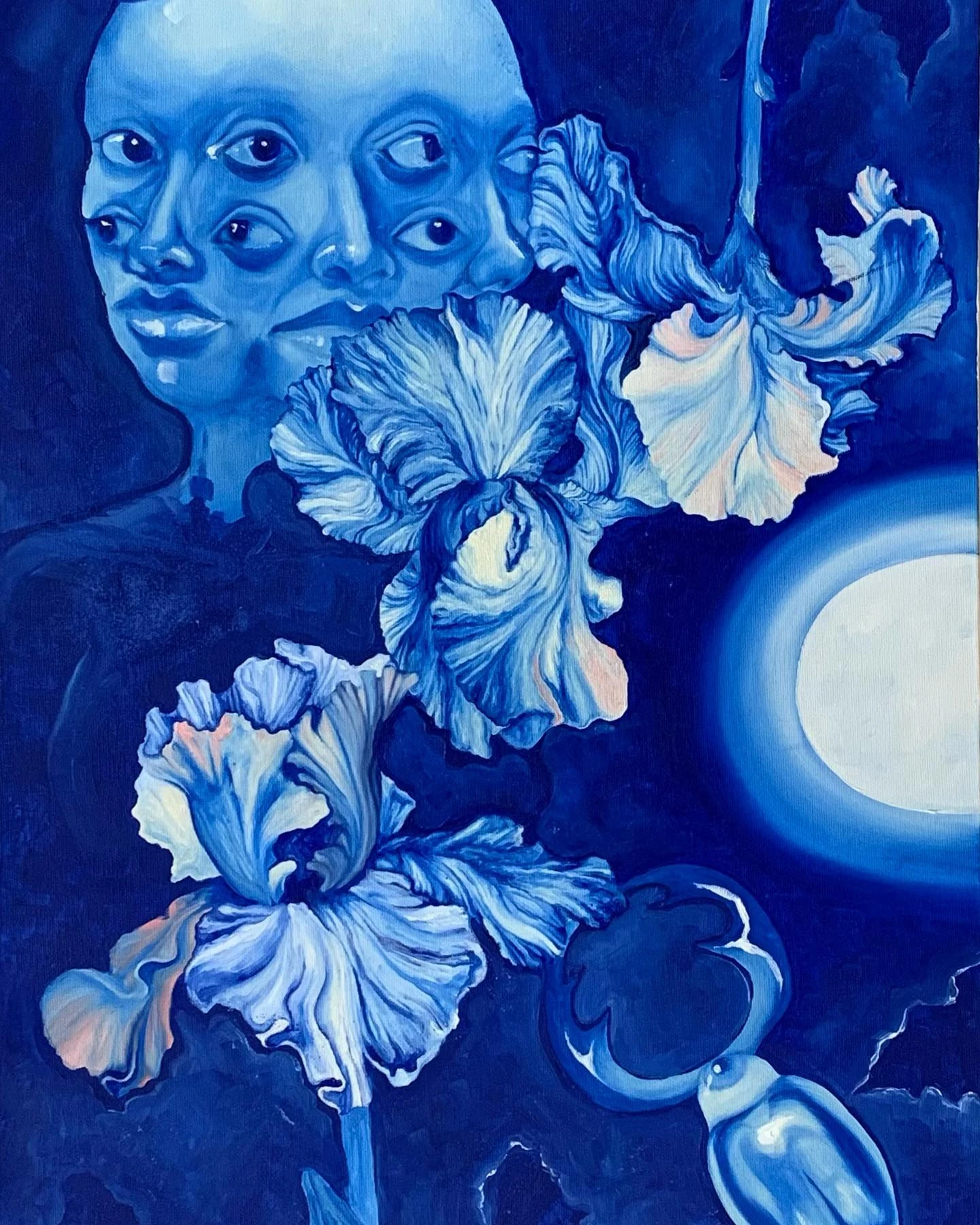 The fantastic elements mentioned appear in many forms—the artist “gives wings” to her heroines, multiplies (or reduces) their eyes, and often blends human and animal traits. These devices evoke associations with the elaborate worlds of Jacek Yerka or the fantastic realism of Wojciech Siudmak, though Litvinova’s art reveals a more traditional painterly quality, visible in her expressive brushstrokes. Her highly spatial figures are often juxtaposed with flat, undefined, two-dimensional backgrounds or ornamental fragments (such as floral motifs). This tension is heightened by the fact that some works can be displayed both vertically and horizontally—or even upside down—without losing their coherence.