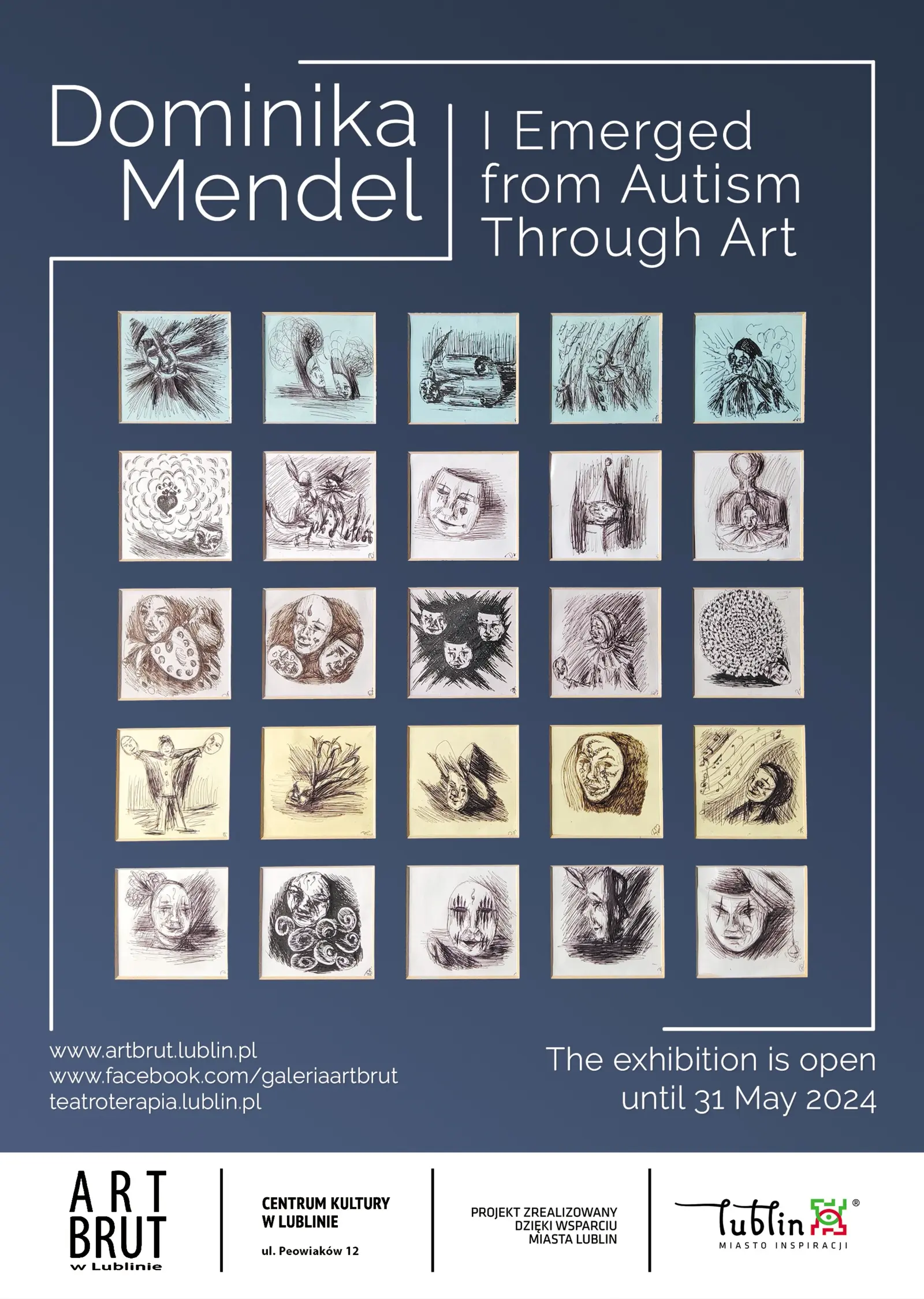 “I emerged from autism through art” — this is how Dominika Mendel defines her condition, her identity, and her life. This phrase also became the title of the retrospective exhibition focusing on her work from 1990–2013. The final paintings were created in 2013, the year in which the artist announced that she had “emerged from autism”. Her last works were a series of thirty images of saints (Świątków) created for the Teatroterapia production Confession in Wood (Spowiedź w drewnie), executed in acrylics, pastels, and oil paints.