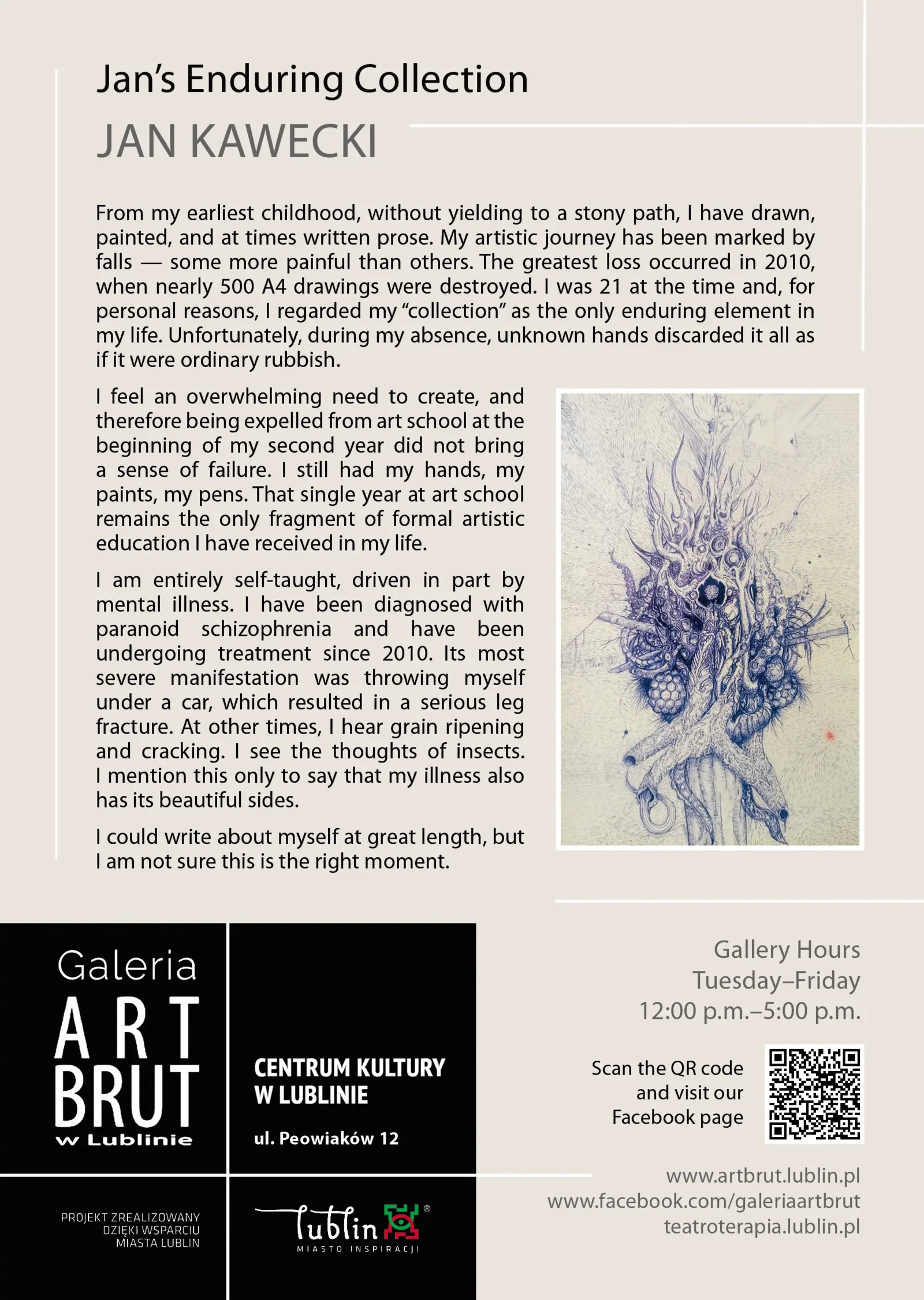 I am entirely self-taught, driven in part by mental illness. I have been diagnosed with paranoid schizophrenia and have been undergoing treatment since 2010. Its most severe manifestation was throwing myself under a car, which resulted in a serious leg fracture. At other times, I hear grain ripening and cracking. I see the thoughts of insects. I mention this only to say that my illness also has its beautiful sides. I could write about myself at great length, but I am not sure this is the right moment.