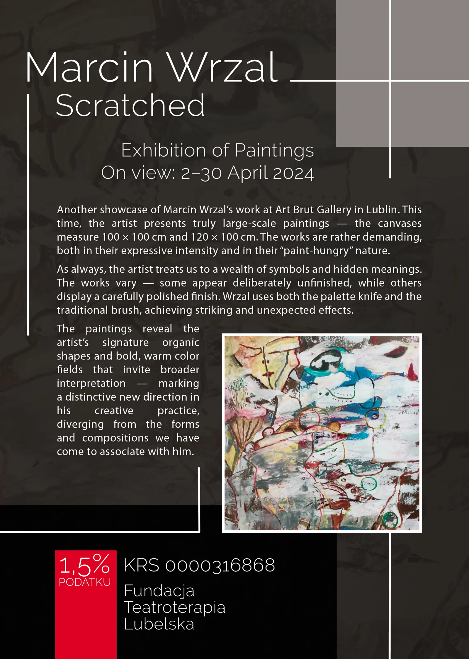 Another showcase of Marcin Wrzal’s work at Art Brut Gallery in Lublin. This time, the artist presents truly large-scale paintings — the canvases measure 100 × 100 cm and 120 × 100 cm. The works are rather demanding, both in their expressive intensity and in their “paint-hungry” nature.