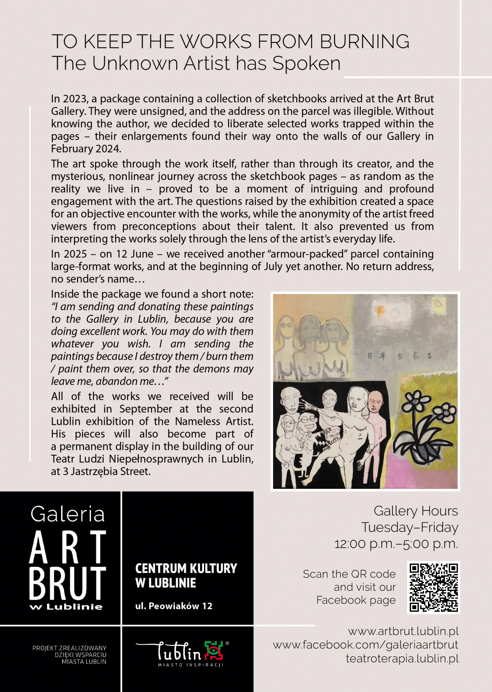 In 2025 – on 12 June – we received another “armour-packed” parcel containing large-format works, and at the beginning of July yet another. No return address, no sender’s name… Inside the package we found a short note: “I am sending and donating these paintings to the Gallery in Lublin, because you are doing excellent work. You may do with them whatever you wish. I am sending the paintings because I destroy them / burn them / paint them over, so that the demons may leave me, abandon me…”