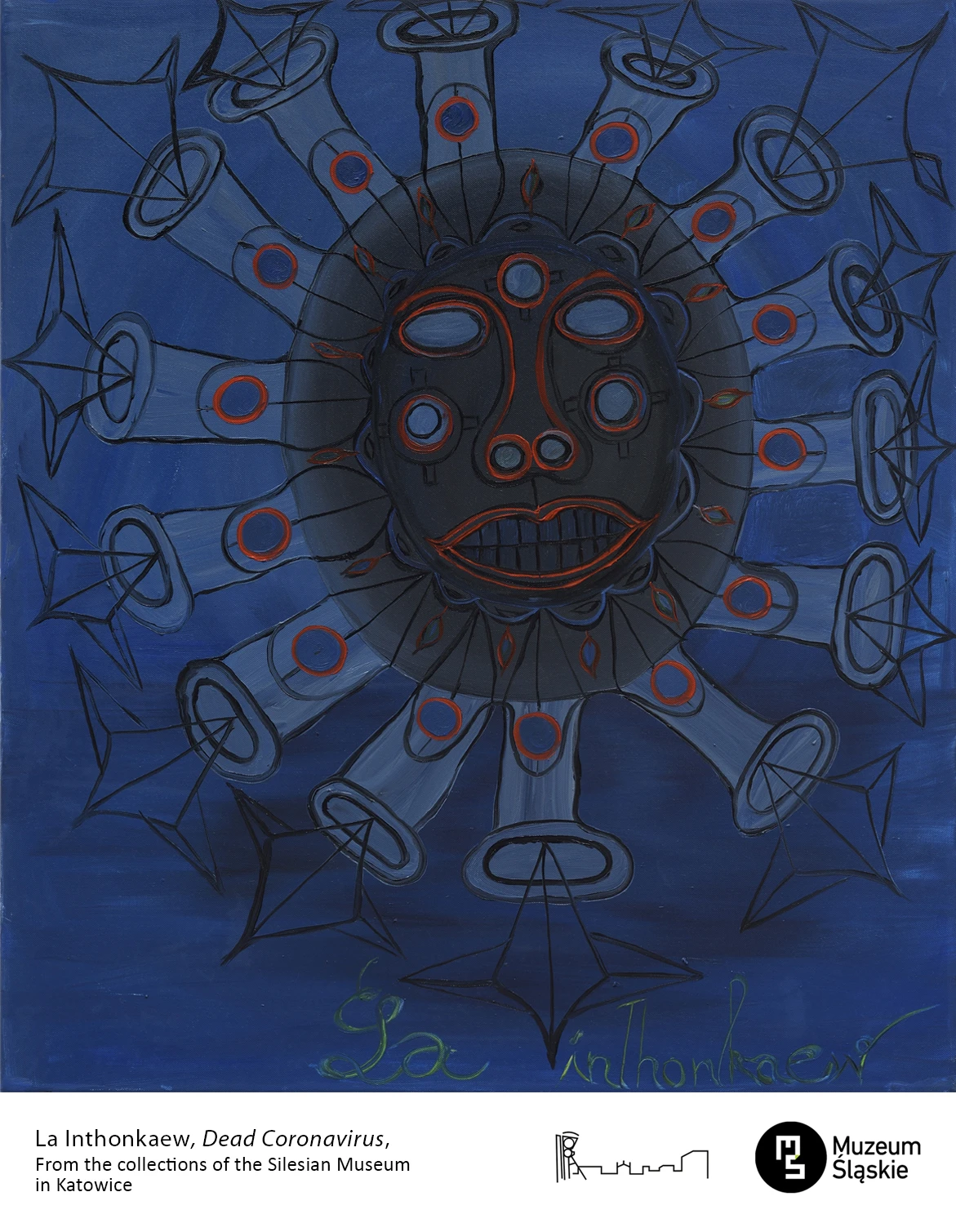 La, born in a small village in central Thailand and now living and creating in Prague, produces works that at first glance are difficult to classify. On the gallery walls, we could see the artist's autobiographical ‘memoirs’, in which she skilfully wove in themes of Thai rituals, present, for example, in the style of painted animals and their symbolism. Next to them were echoes of the recent lockdown and fanciful representations of the sinister coronavirus (in one of the works – definitely the most distinctive and artistically refined – depicted as a ritual tribal mask).